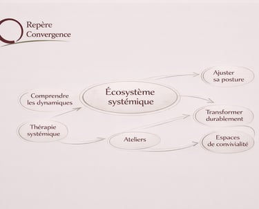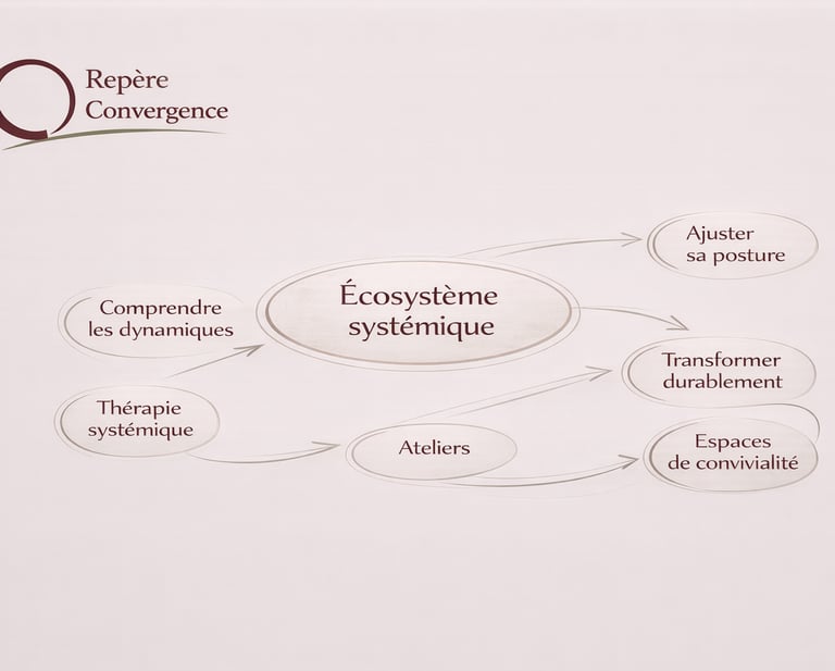 Repère Convergence articule plusieurs espaces complémentaires : la thérapie systémique, les cycles d’accompagnement, les ateliers exploratoires et, à terme, une dimension communautaire et un lieu physique. Chaque porte d’entrée permet d’avancer à son rythme dans un même écosystème, selon ses besoins, son niveau d’engagement et la nature de la situation traversée.